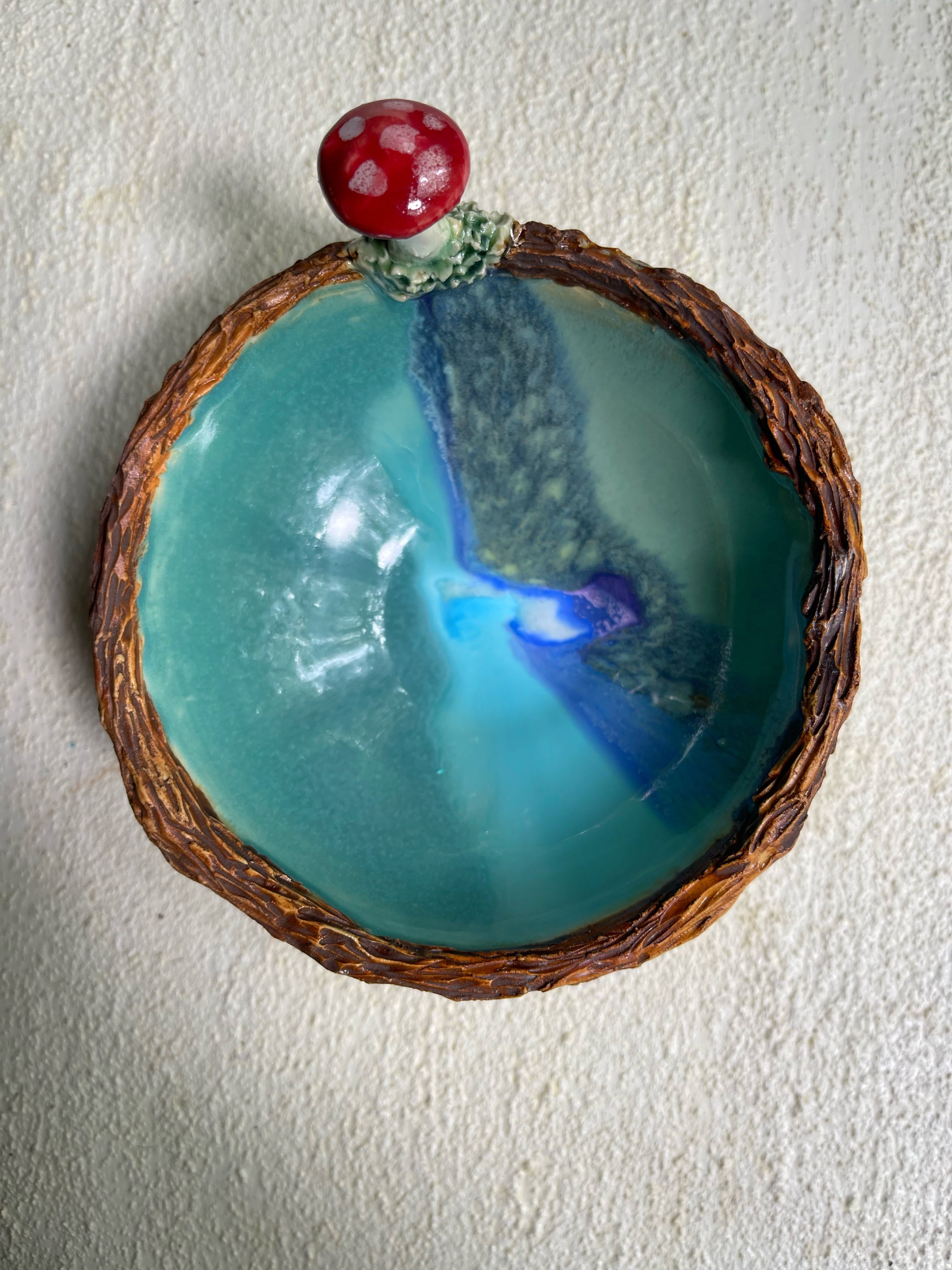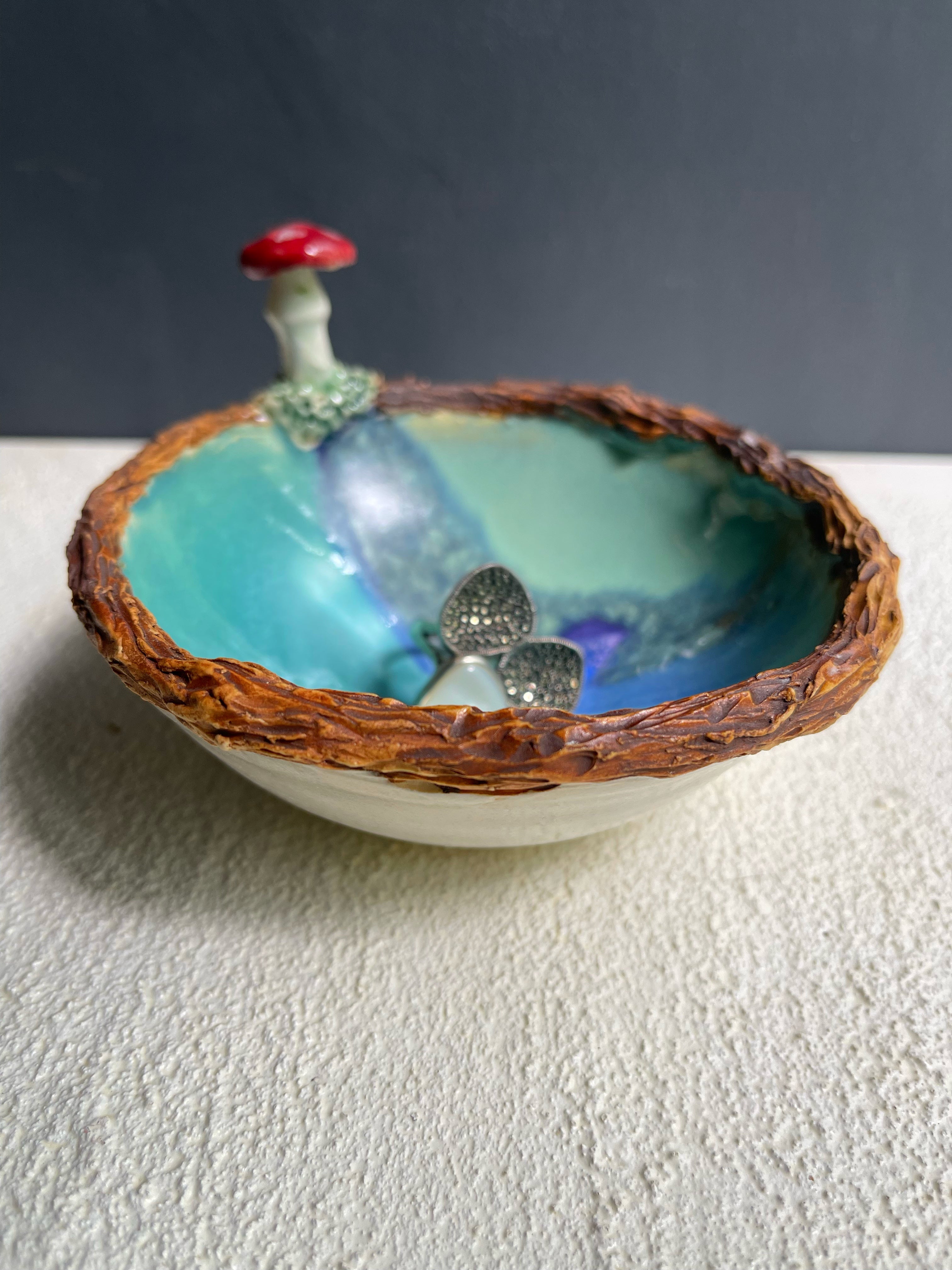 wheel thrown tray with tree branch rim and a mushroom on moss. Use as a ring, tea bag, candle or incense holder.