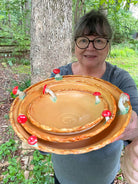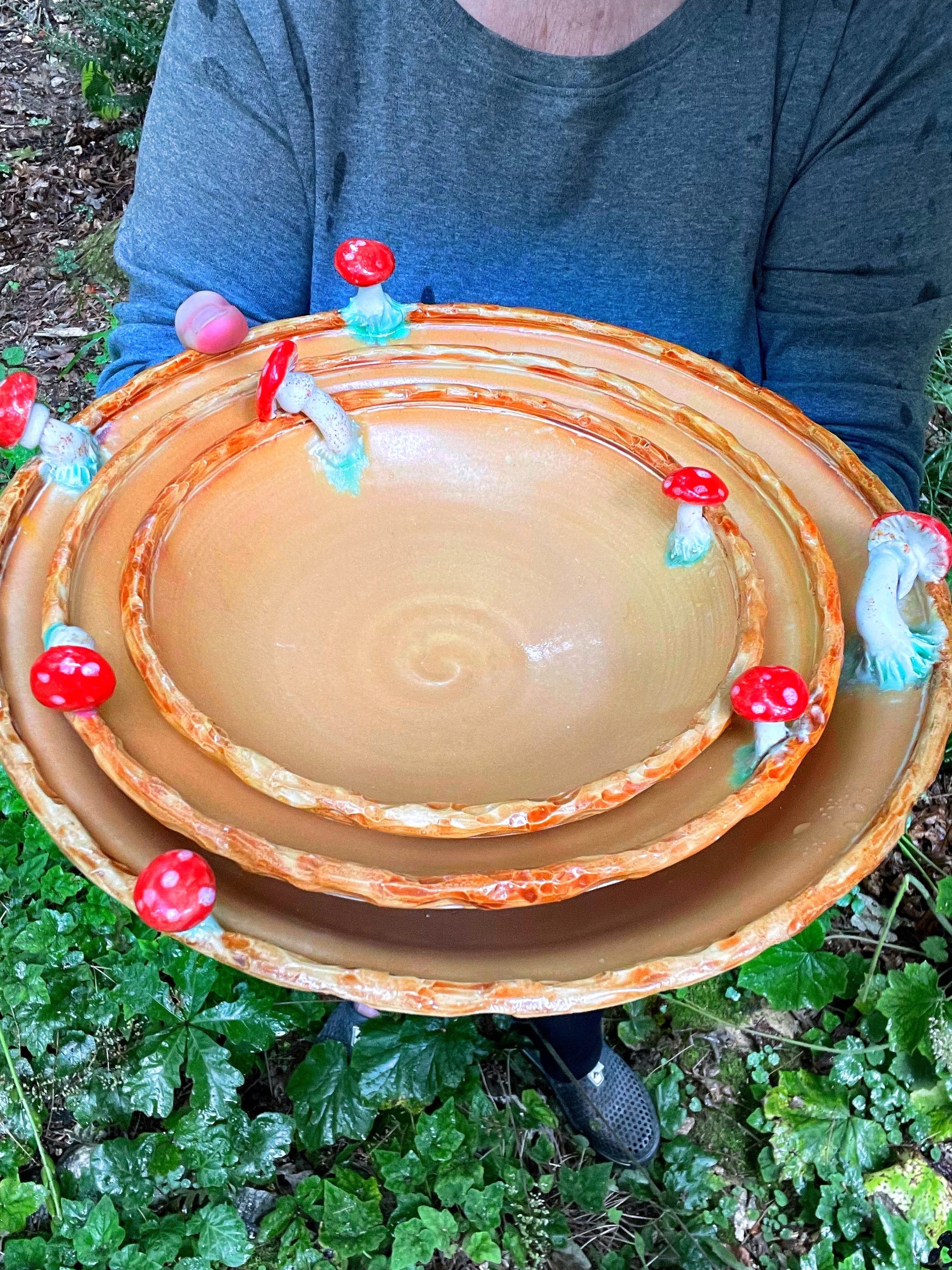 Each bowl has a tree branch rim and multiple mushrooms growing. Beautiful apricot glaze inside and speckled white outside