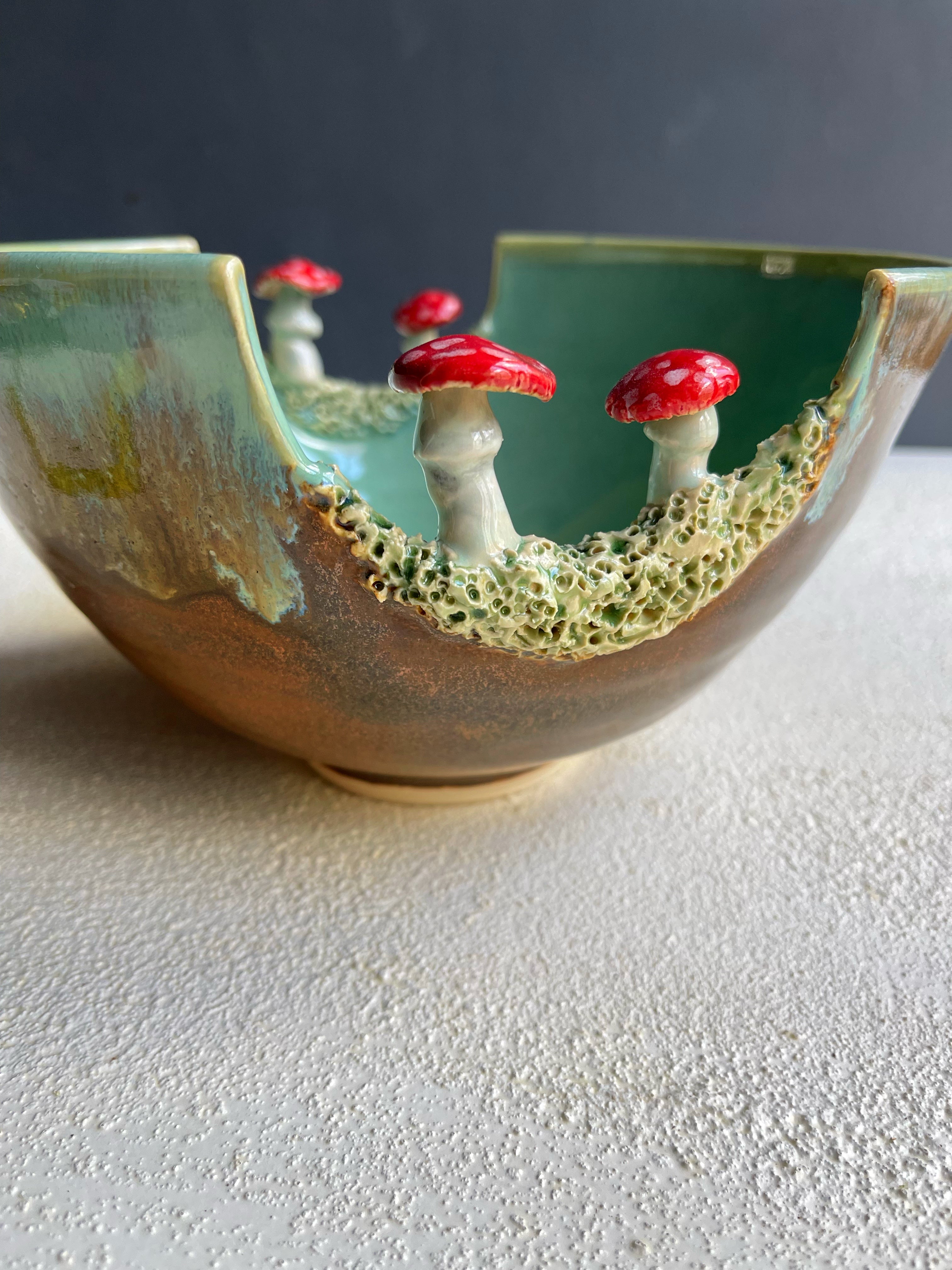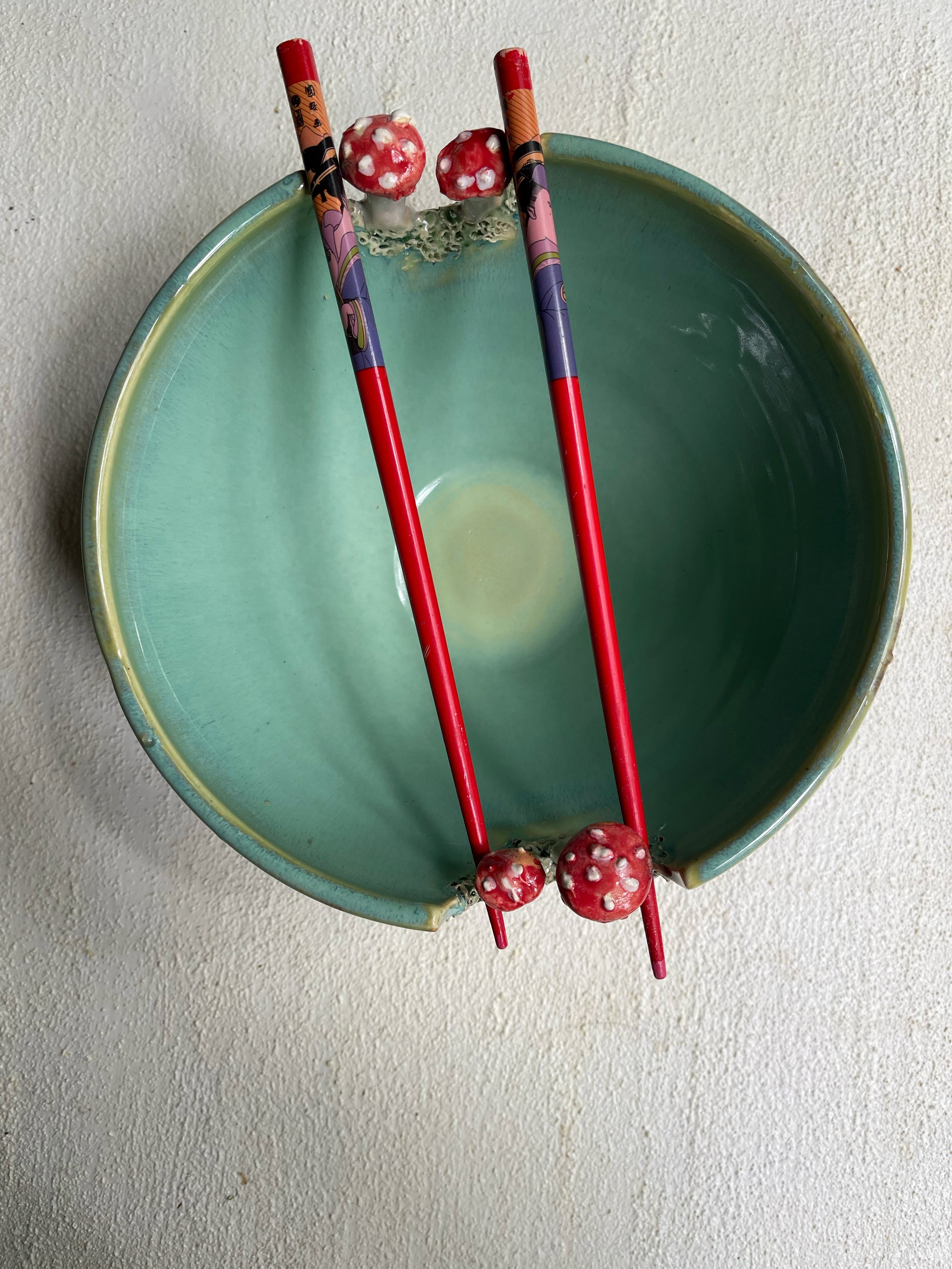 A noodle bowl thrown on a wheel with hand sculpted mushrooms for chopstick rests. It also makes a serving bowl.