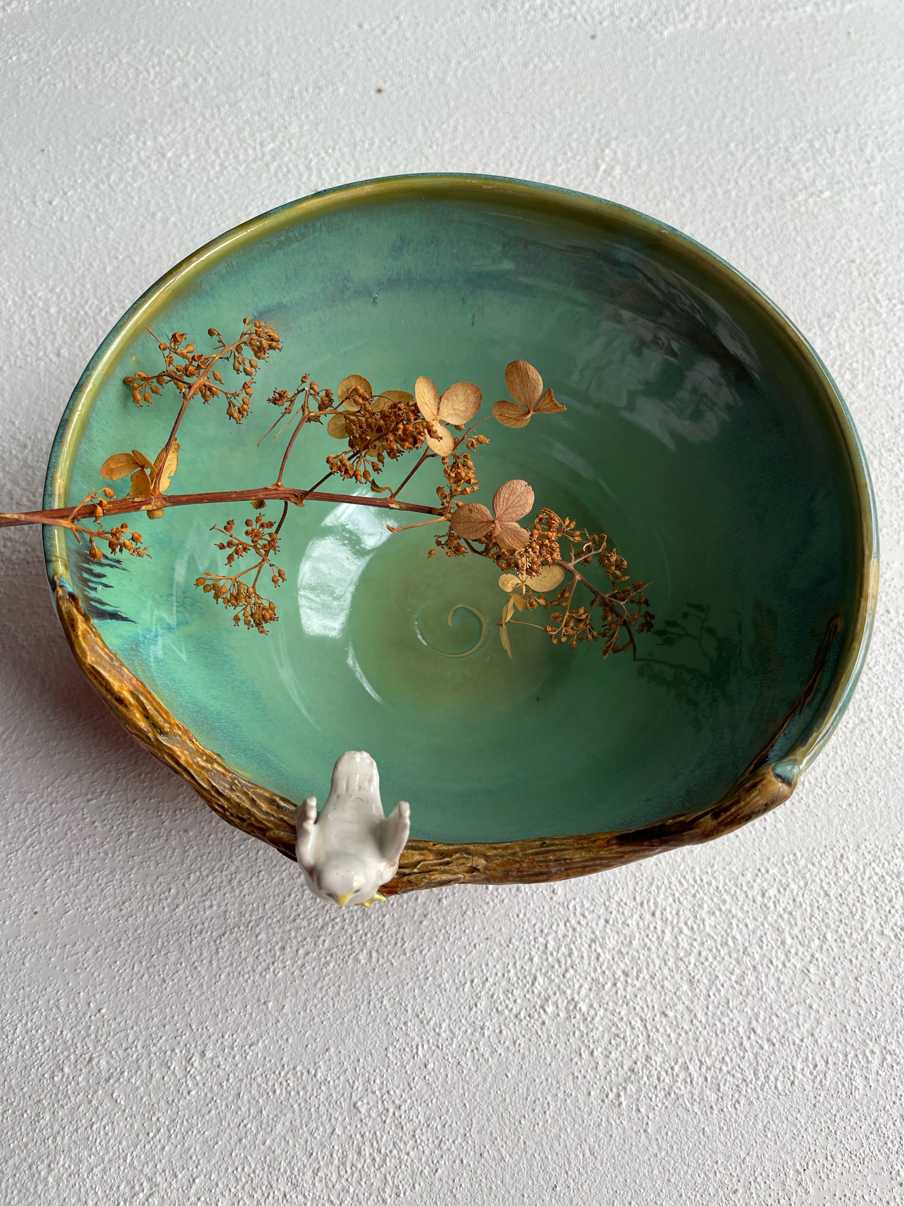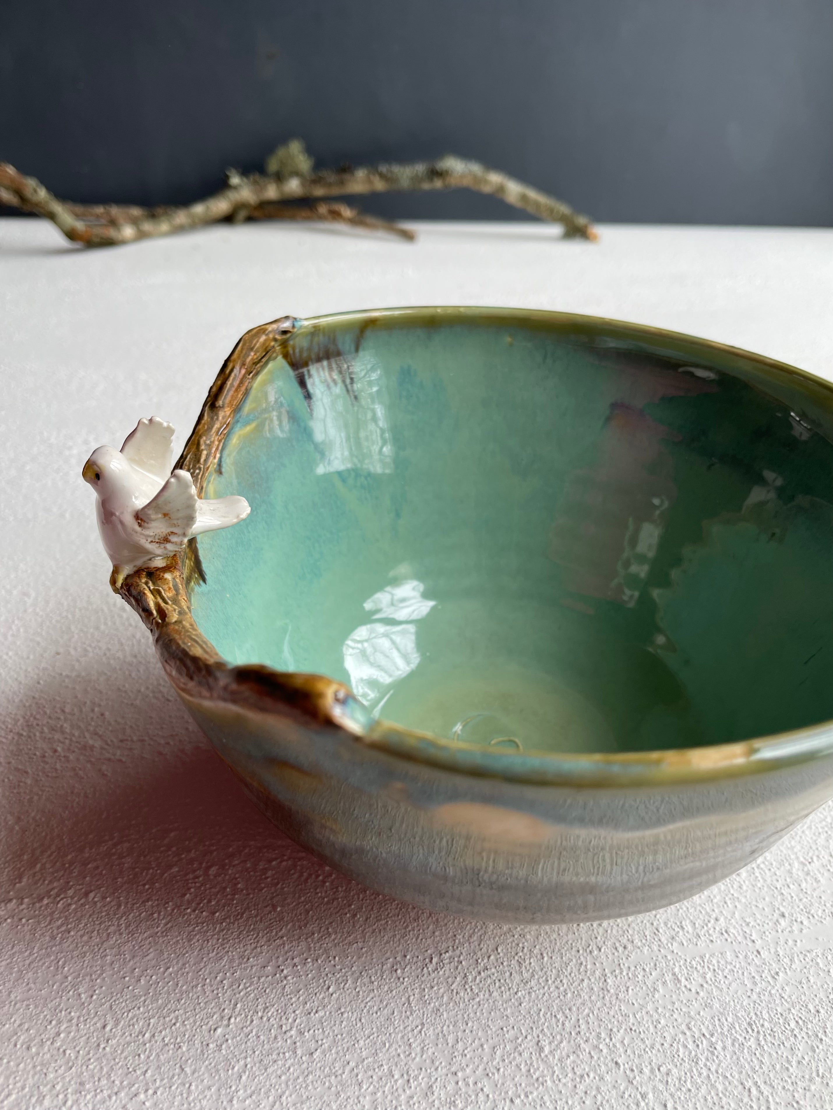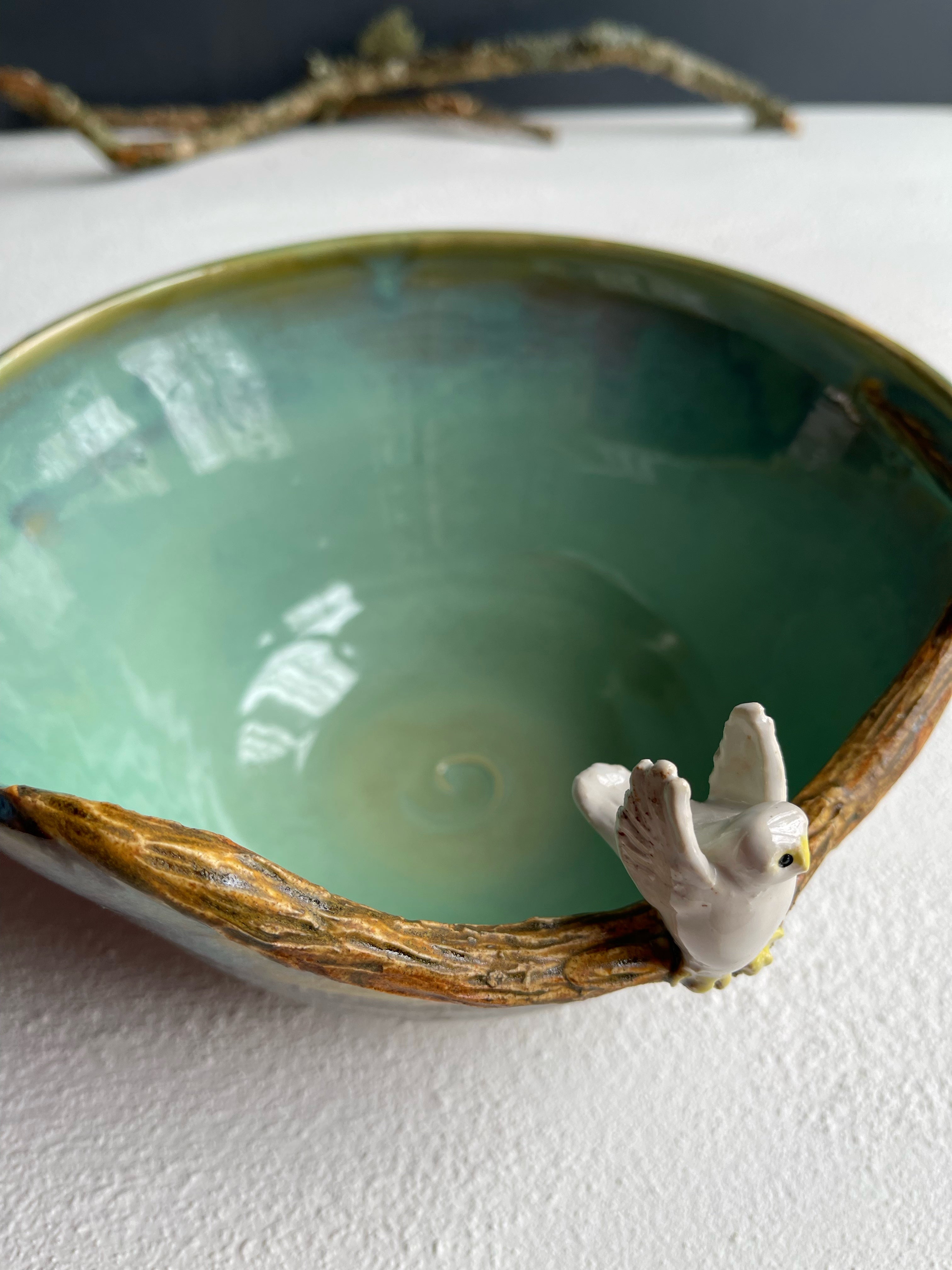 A hand sculpted owl has landed on a branch with wings extended and claws gripping for balance. This special piece may be used as a special centerpiece or as a serving bowl. Owls see at night and she will help you navigate in difficult times.